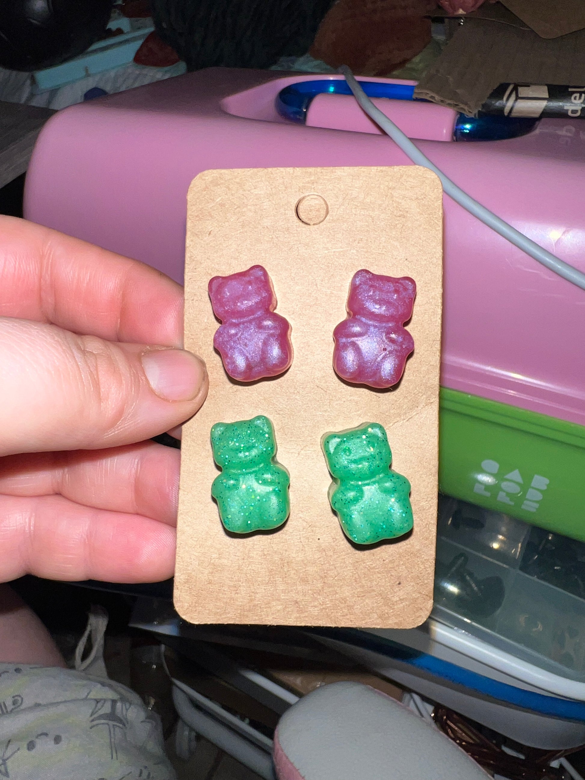 The perfect accessory for any candy lovers! These Gummy Bear Stud Earrings come in a set of 2 pairs of earrings in a variety of colors and textures.